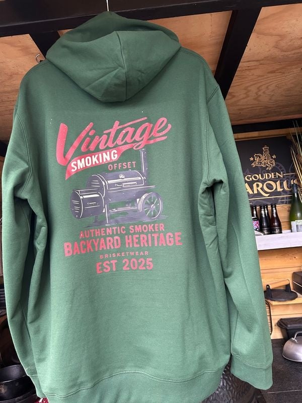De Vintage Smoking Offset Hoodie is geïnspireerd op klassieke offset smokers en old school backyard BBQ. Rauw, eerlijk en zonder fratsen. De grote rugprint ademt vintage heritage: een authentieke smoker, verweerde details en duidelijke taal. Dit is waar Brisketwear voor staat.