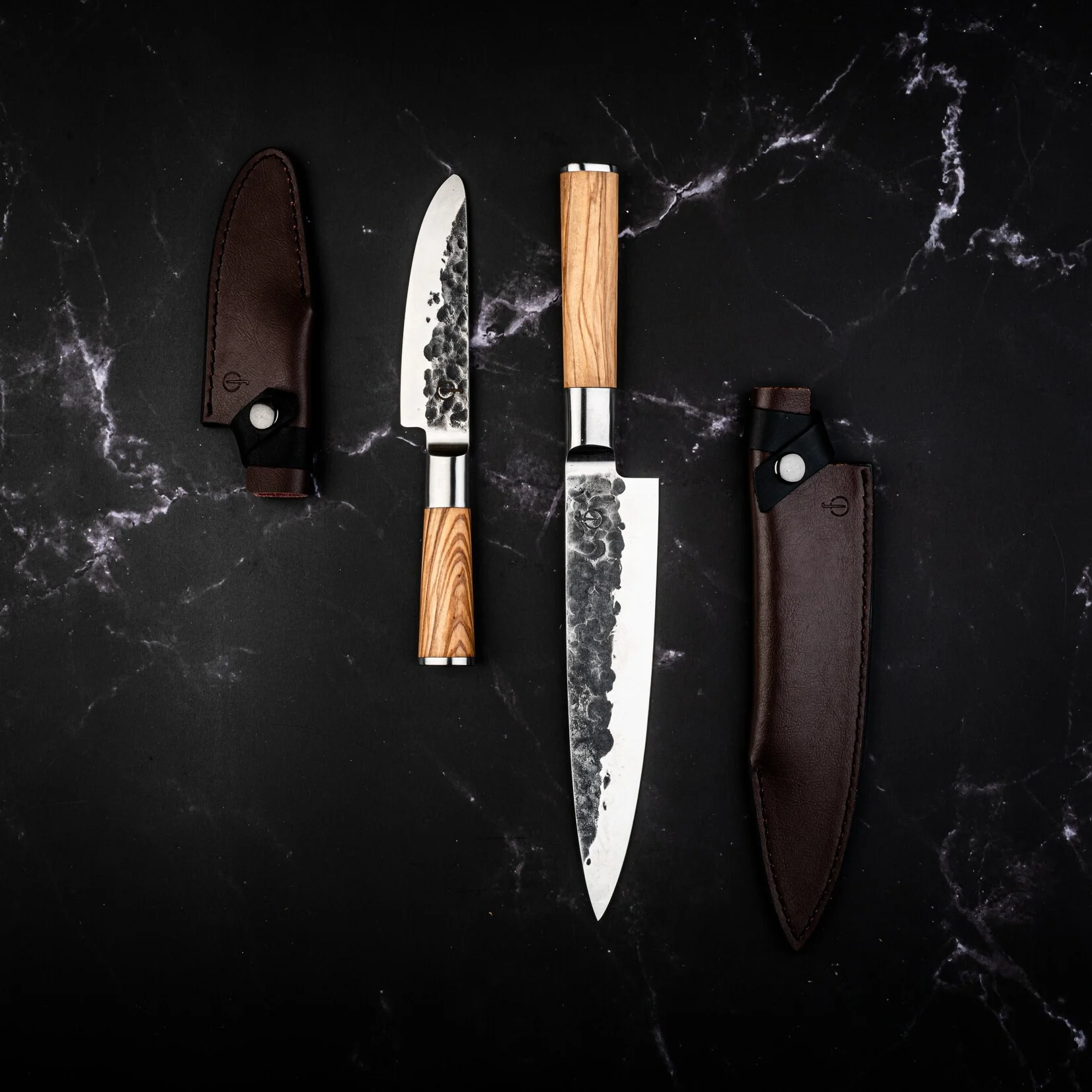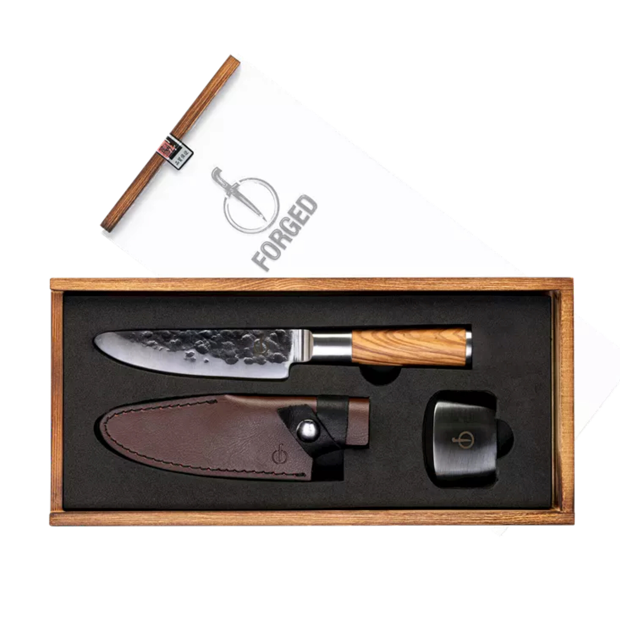 Het Forged Olive kinderkoksmes is gemaakt van 3Cr14 staal, heeft een hardheid van 54 Rockwell, een lemmetdikte van 2 mm, een lemmetlengte van 12 cm en een olijfhouten handvat waardoor het mes niet vaatwasmachinebestendig is. Verpakt in een luxe houten doos en met 10 jaar garantie. Te gebruiken vanaf 7 jaar en altijd onder toezicht.