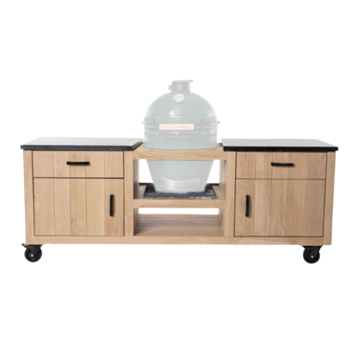 Dit mooie design meubel is gemaakt van robuust eikenhout en voorzien van een composiet blad. In de kasten en lades heb je opbergruimte voor je barbecue accessoires en kookgerei. De tafel is standaard uitgevoerd met dikke zwarte handgrepen. Samen vormen ze een mooi geheel met het zwarte werkbad en het robuuste eikenhout. De tafel is voorzien van 4 zwarte wielen. Zo kun je deze gemakkelijk verrijden naar iedere gewenste plek.