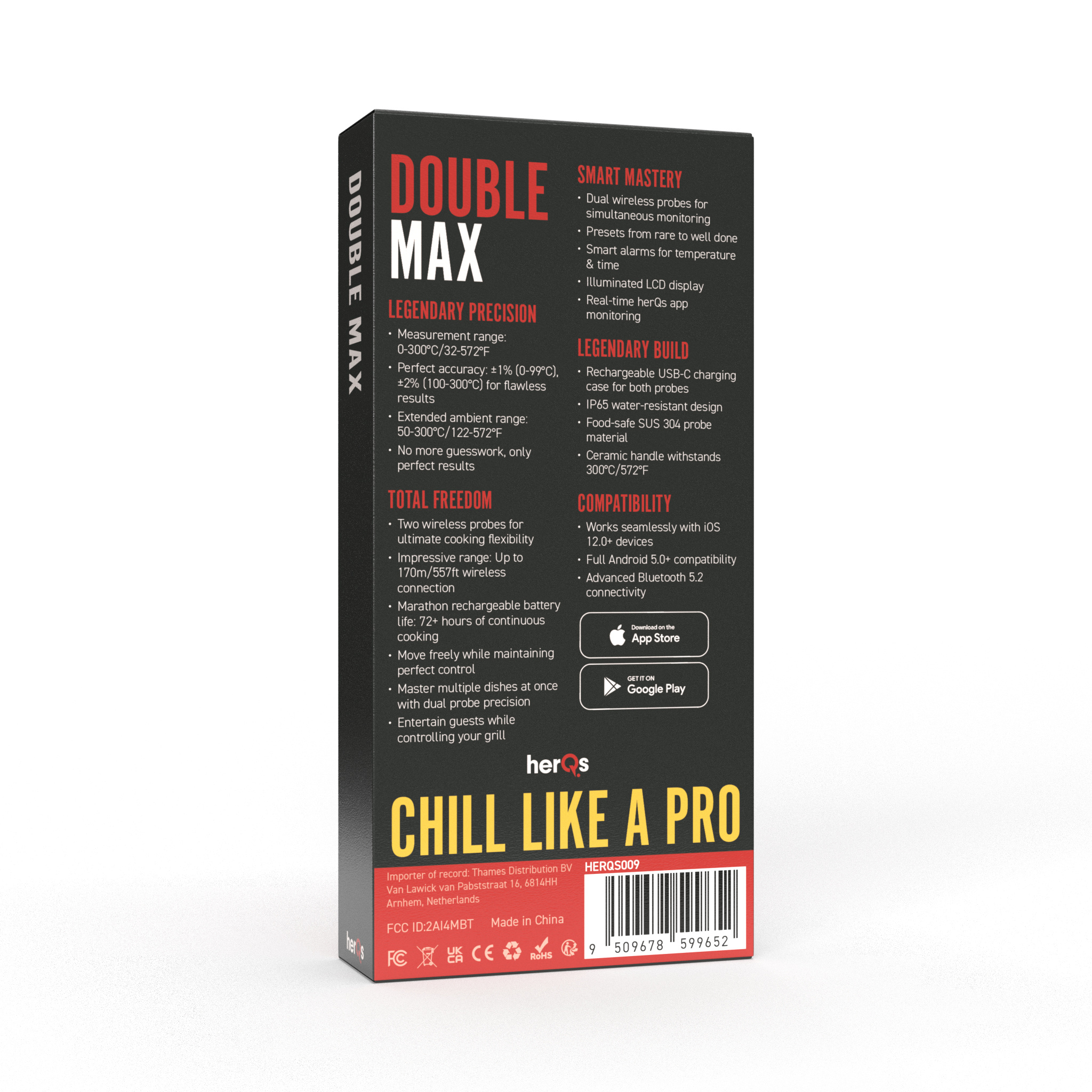 De HerQs Double Max tilt uw kookervaring naar een hoger niveau met zijn ultradunne, geavanceerde vleesthermometer die niet alleen efficiënt is, maar ook geheel draadloos. In vergelijking met zijn kleine broertje komt de herQs Double Max met 2 draadloze probes. De slanke, nauwelijks zichtbare probes zijn in staat om temperaturen tot een verbazingwekkende 500 graden te weerstaan. Dit maakt de HerQs Double Max ideaal voor zowel hobbykoks als professionals die op zoek zijn naar precisie en betrouwbaarheid.