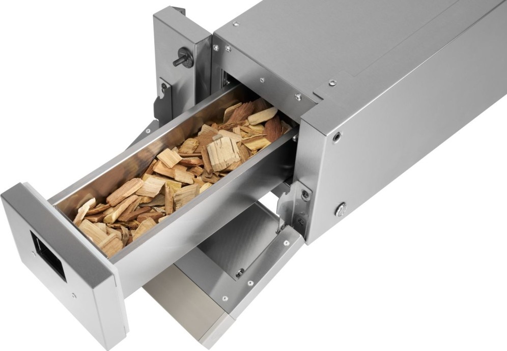 Verander uw gasbarbecue in een handige smoker met deze compacte elektrische smokerbox accessoire. Met afmetingen van 21,6" x 10,3" x 7,9" is het de perfecte maat om een authentieke rooksmaak toe te voegen aan uw favoriete gegrilde gerechten. De meegeleverde handgreep maakt het mogelijk om de rooklade veilig en eenvoudig te verwijderen, zelfs tijdens gebruik. Ontworpen als een uitneembare lade, schuift de lade soepel uit voor snelle navullingen en moeiteloos schoonmaken. Een ingebouwde ventilator werkt samen met een speciaal venturisysteem om een gecontroleerde omgeving te creëren die schone, constante rook produceert. De rook komt nooit in aanraking met de ventilator, waardoor de interne onderdelen schoon en beschermd blijven.