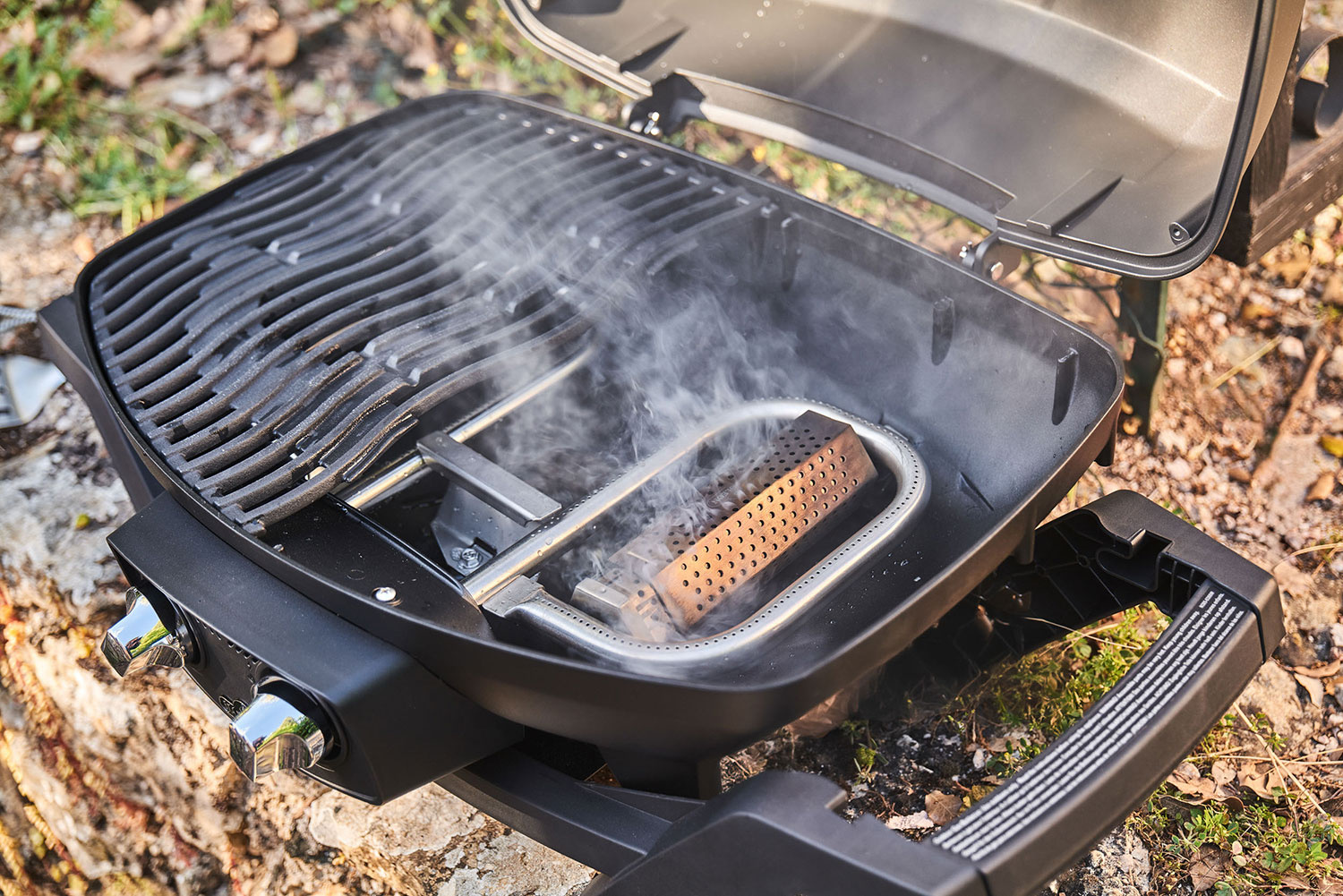De doos wordt eerst gevuld met geweekte rooksnippers en vervolgens onder het grillrooster geplaatst. Het grootste voordeel is dat de smokerbox geen grillruimte in beslag neemt. Zodra de brander is aangestoken, beginnen de rookchips te gloeien en produceren ze een constante, fijne rook. De rookbox kan ook eenvoudig met rookpellets worden bediend.