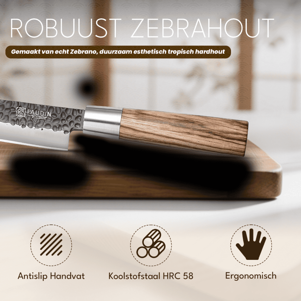 Gemaakt van hoogwaardig staal met gehamerd oppervlak voor minder wrijving, en uitgevoerd met een ergonomisch zebranohouten handvat — perfect voor zowel vlees, vis als precieze snijwerk.