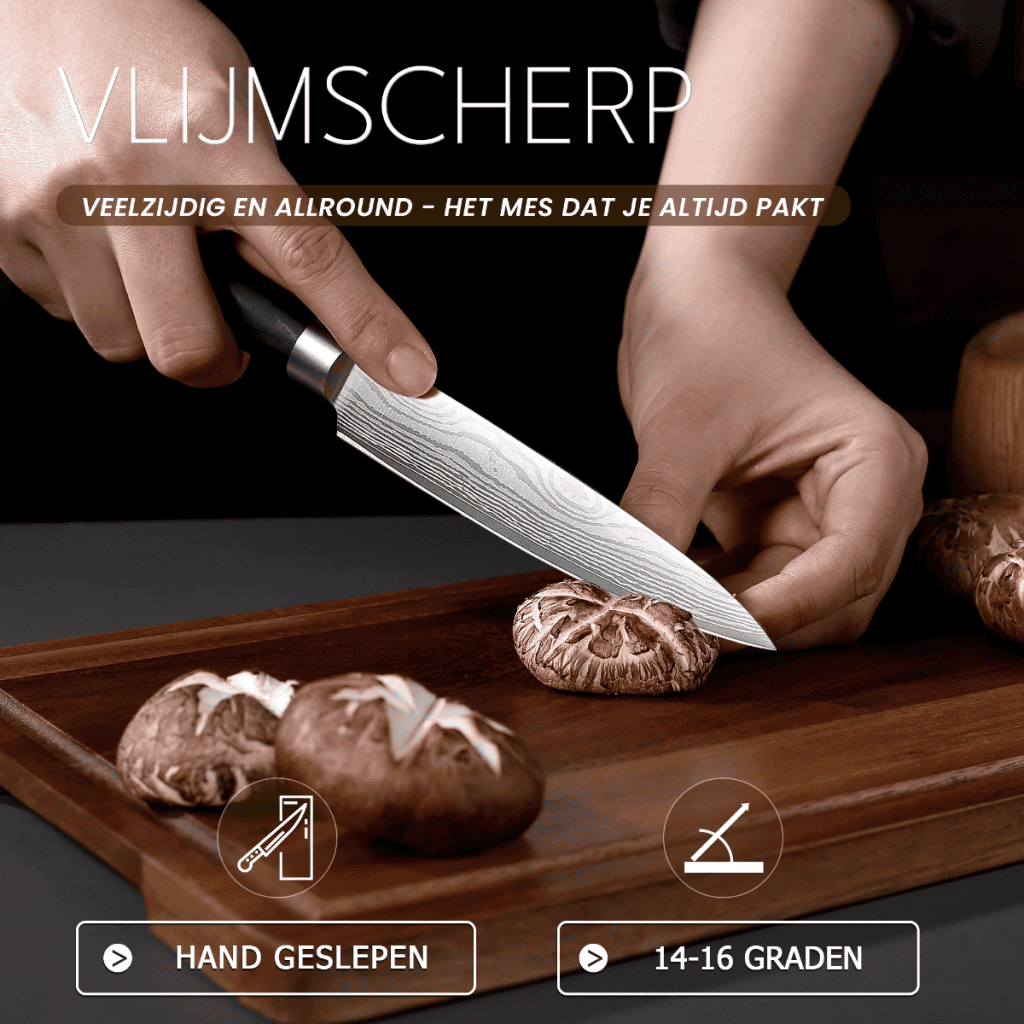 Esthetisch ingelaserd Damascus patroon, waardoor het mes een blikvanger in de keuken is.