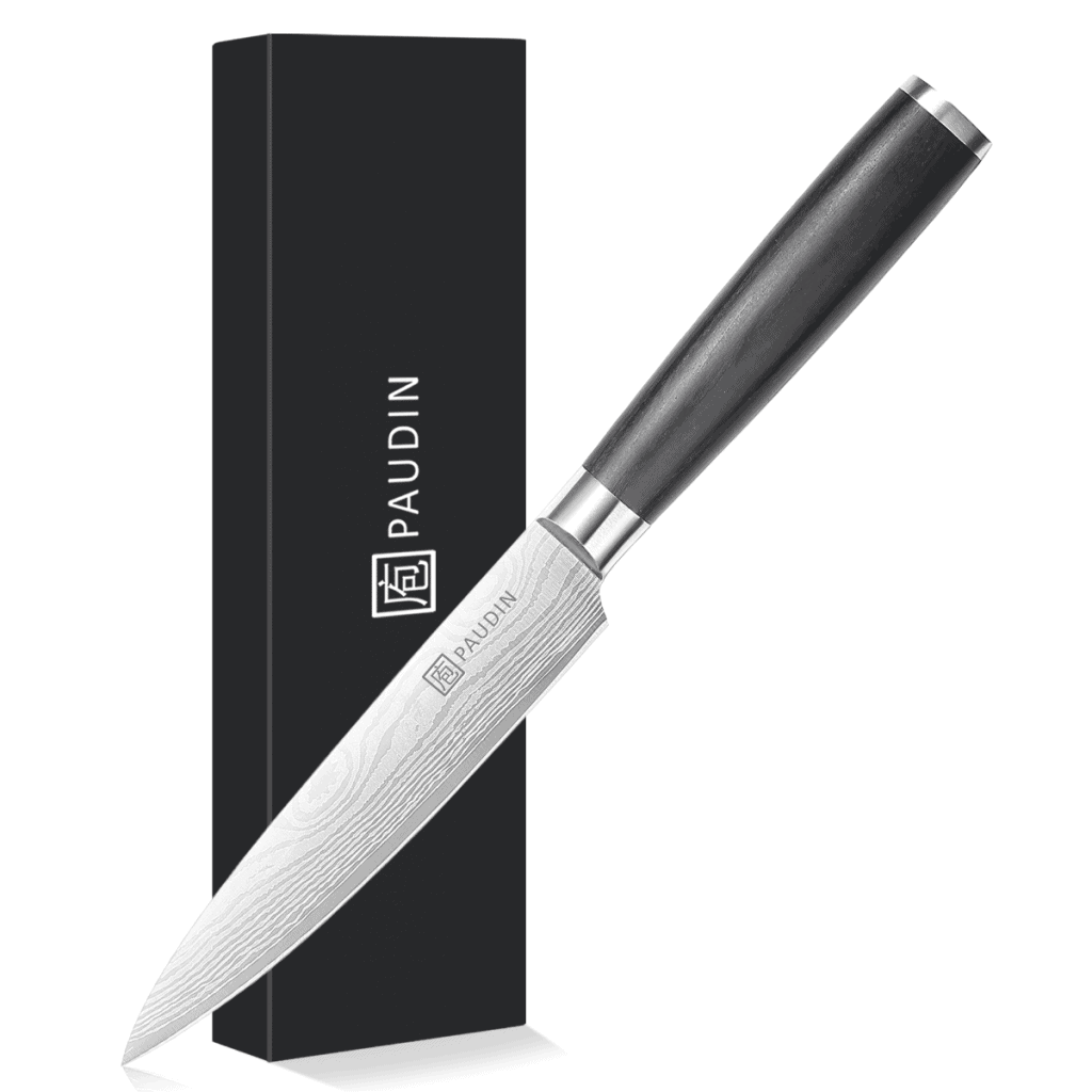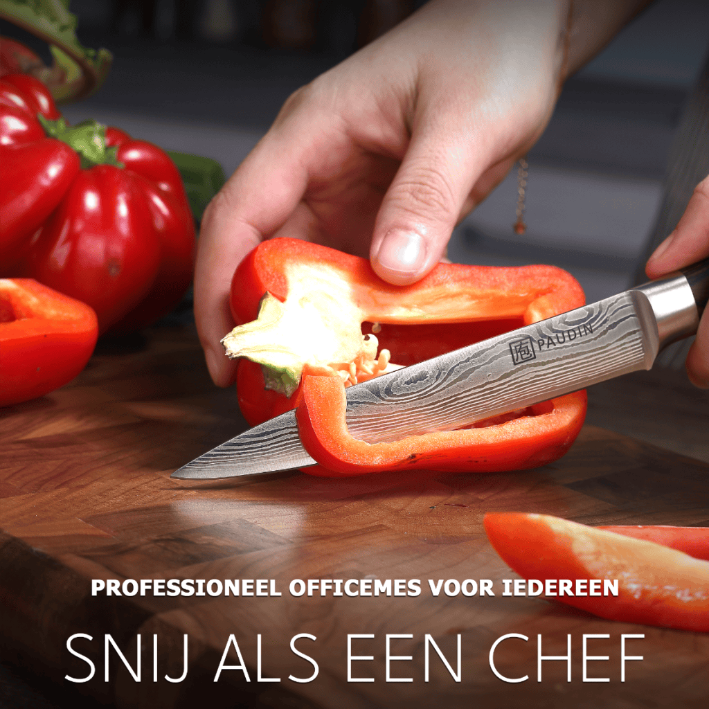 Ontdek het PAUDIN Aichi Wave KW5 Officemes. Dit 12,5 cm lange keukenmes uit de Aichi Wave collectie, vervaardigd uit hoogwaardig koolstofstaal, is een ware aanwinst voor iedere keuken. Met zijn esthetisch ingelaserd Damascus patroon is dit KW5 Officemes niet alleen functioneel, maar ook een prachtig object om te zien. Het mes heeft een ergonomisch handvat dat zorgt voor een fijne en stevige grip tijdens het snijwerk.