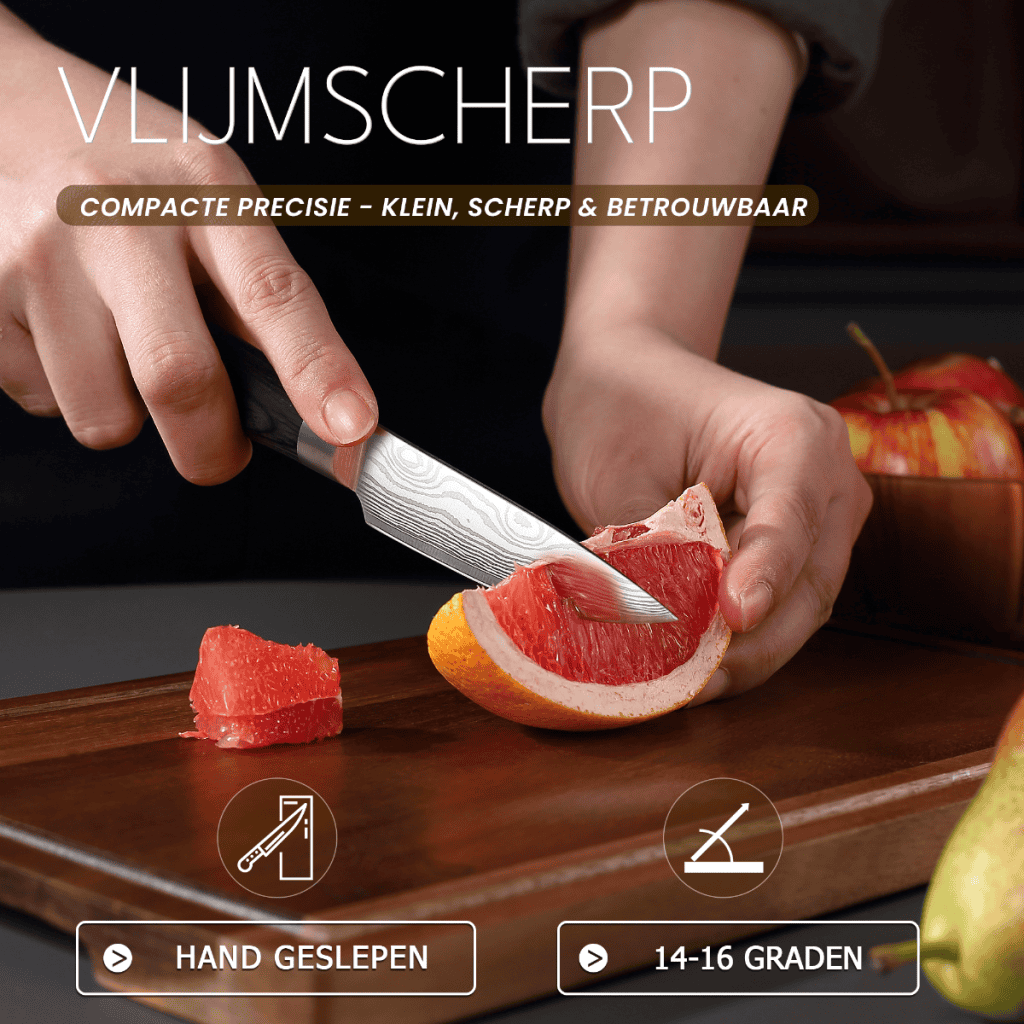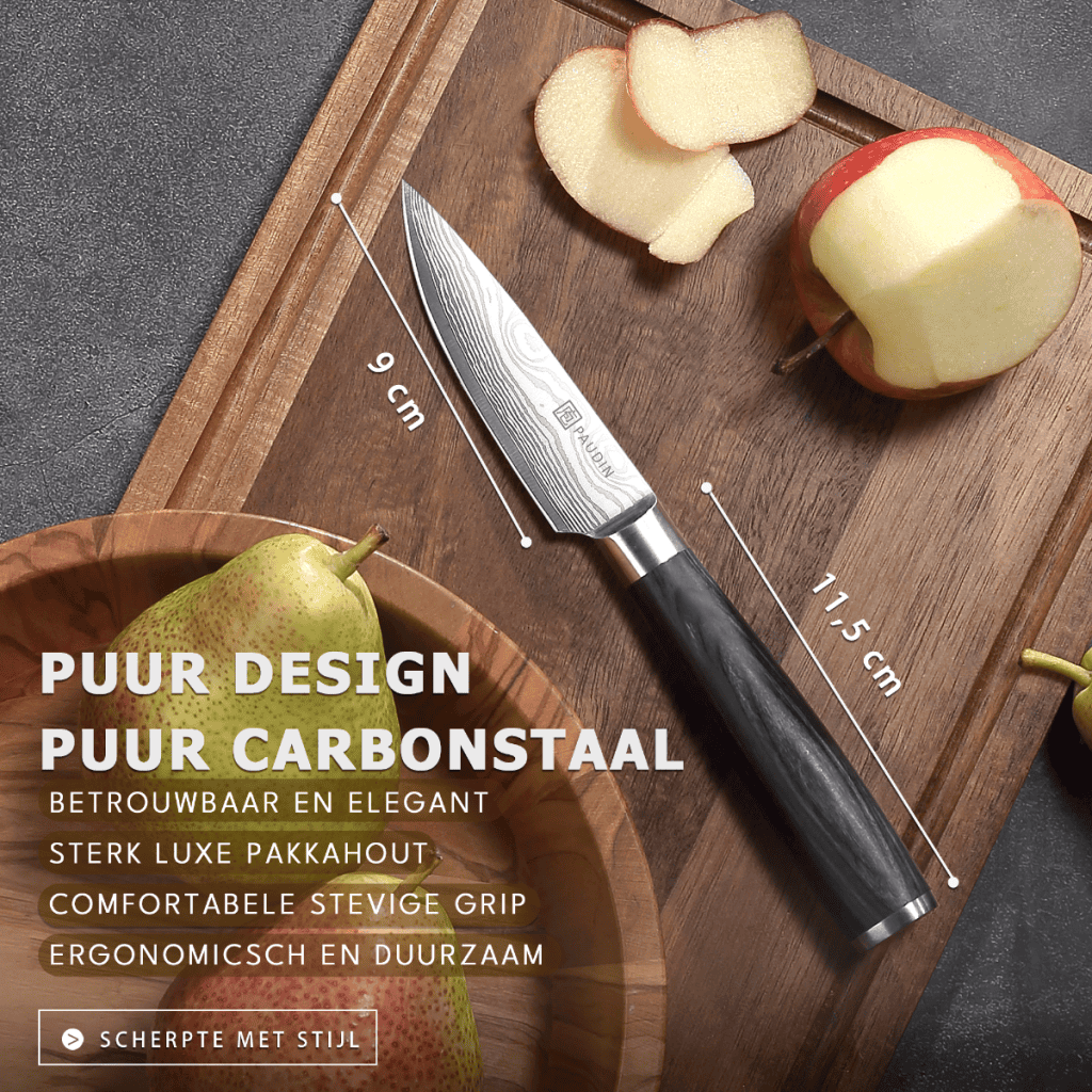 Vervaardigd uit cryogeen gehard koolstofstaal (HRC 56+) en voorzien van een ergonomische handgreep, perfect voor het schillen, snijden en fijn verwerken van allerlei groenten en kruiden.