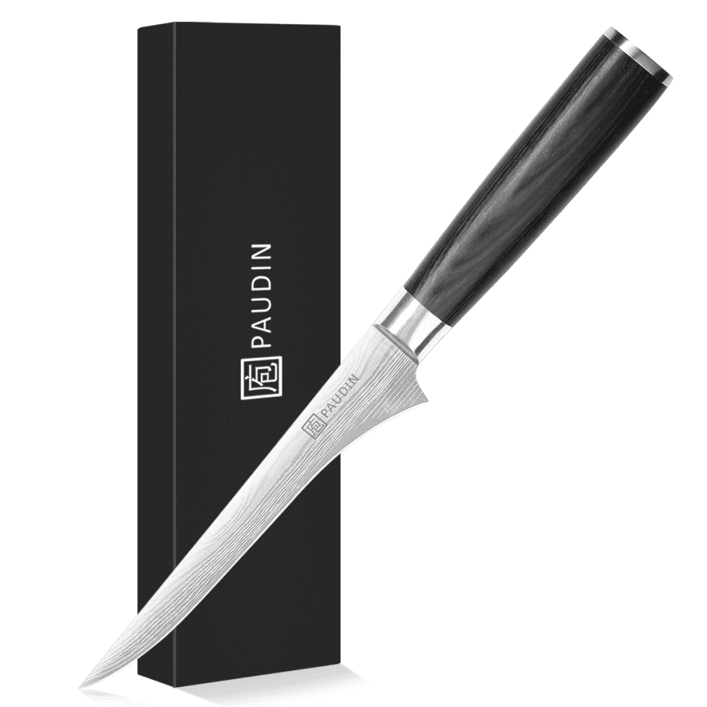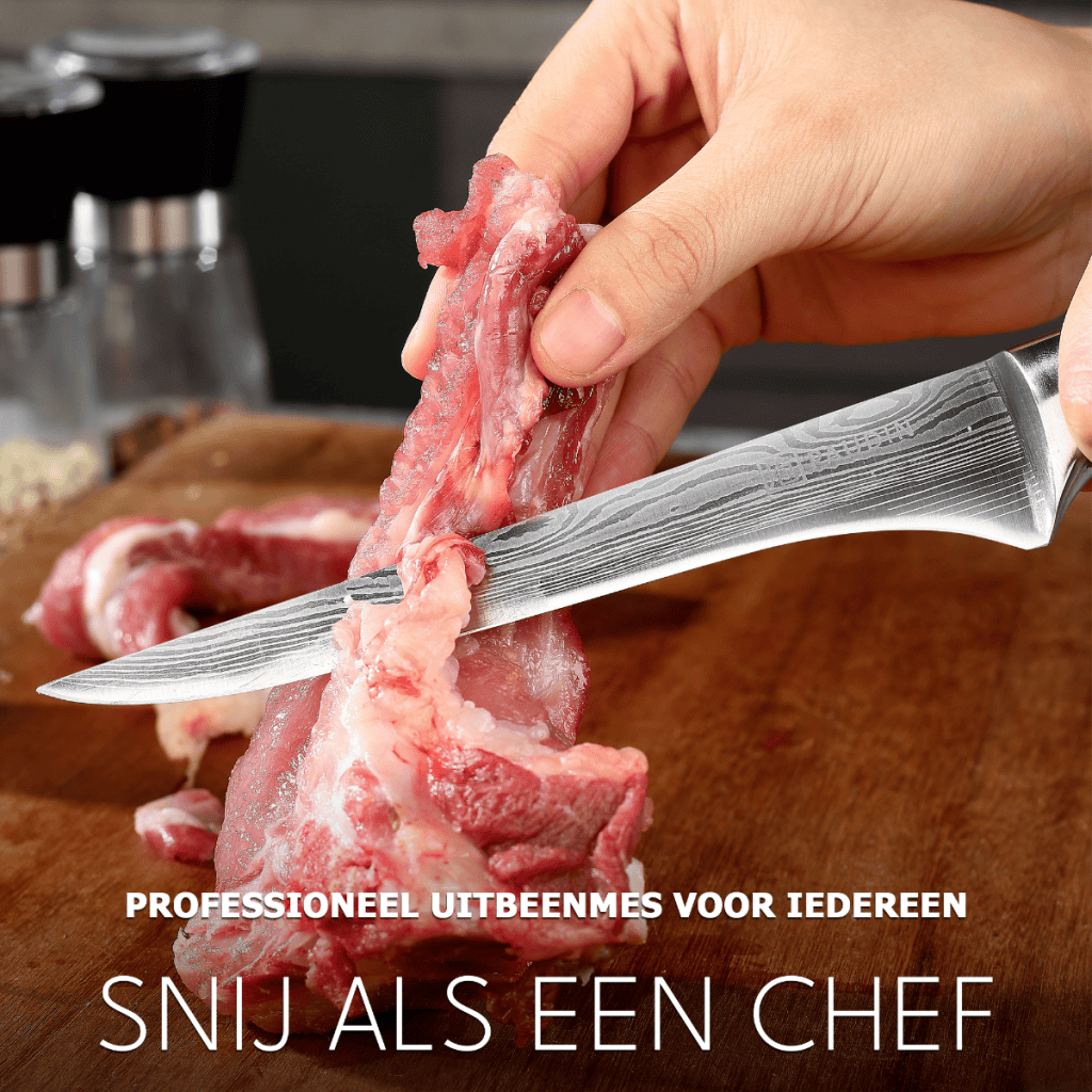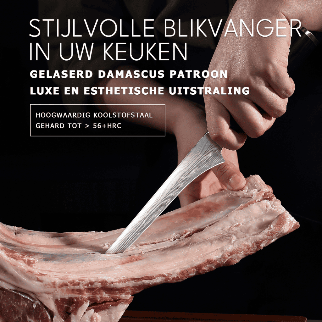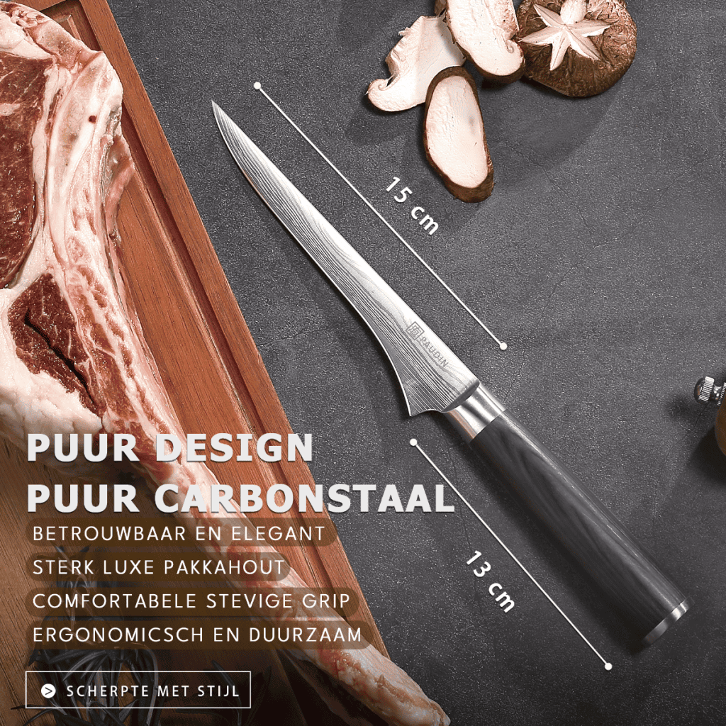 Dit hoogwaardige Japans georiënteerde Uitbeenmes is vervaardigd uit hoogwaardig koolstofstaal, wat zorgt voor langdurige scherpte, slijtvastheid en corrosiebestendigheid. Het subtiel gelaserde Damascus patroon geeft het mes een stijlvolle en professionele uitstraling.