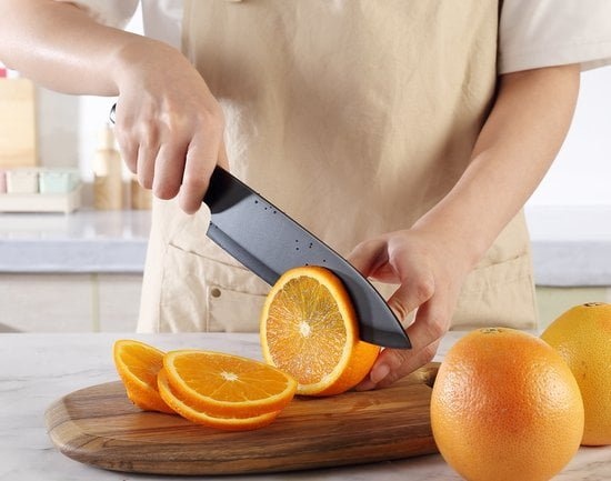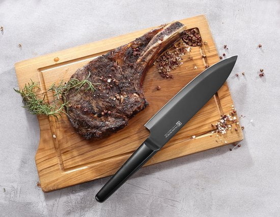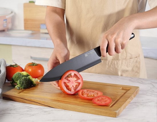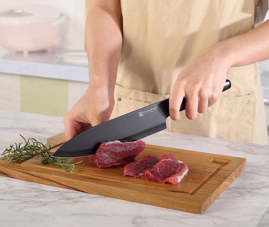 Deze zeer slijtvaste coating geeft dit mes een stoere en robuste uitstraling en zorgt er ook voor dat groenten en vlees en vis minder snal aan het mes blijven plakken. De keramische coating is zeer duurzaam maar is en blijft een coating. Een uitgebreide test van 6 maanden elke dag op 70 graden in de vaatwasser laat slechts enkele kleine beschadigingen en roestpuntjes zien. Voor een langere levensduur liefst, zoals eigenlijk geld voor ieder koksmes, na gebruik met de hand afwassen en afdrogen met een zachte theedoek.