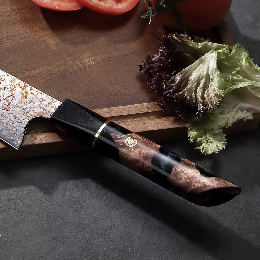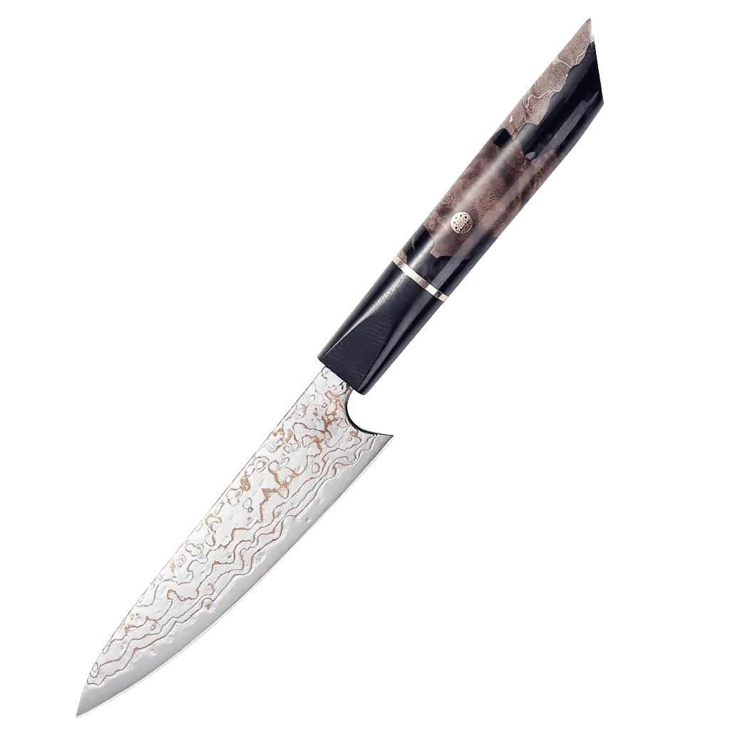 Het mes is vervaardigd uit 67 lagen Damascusstaal en heeft een ergonomisch handvat van hout en epoxy. Het is ideaal voor precisiewerk zoals fijn snijden, schillen en kruiden.