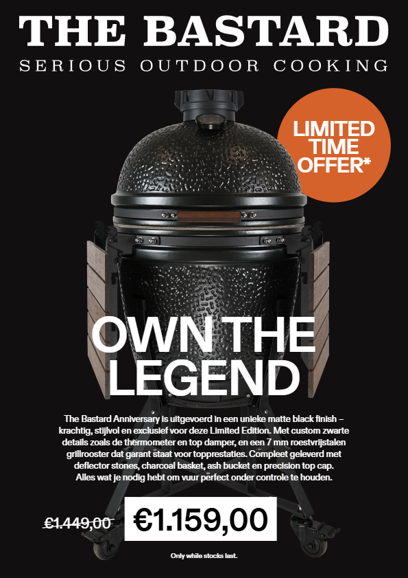 De The Bastard Large Anniversary Edition is een exclusieve uitvoering die slechts beperkt verkrijgbaar is. Deze speciale editie brengt de kracht van de Large kamado samen met een luxe, volledig zwarte look. Voor iedereen die graag in stijl kookt én iets opvallends in de tuin wil hebben. Of je nu pizza’s afbakt, steaks grilt of low & slow aan de slag gaat: met deze Limited Edition wordt elk buitenkookmoment een stukje bijzonderder.