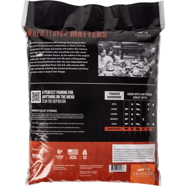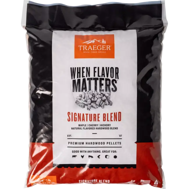 Of je nu grilt, rookt of braadt, deze 100% natuurlijke van hardhouten pellets, zonder vul- en bindmiddelen of schors zorgen voor een schone, efficiënte verbranding en een pure houtgestookte smaak. Zo kan je elke keer consistent blijven koken met houtgestookte perfectie. Traeger Signature Blend Pellets geven een veelzijdige en robuuste smaken aan je gevogelte, varkensvlees, groentes en gebakken producten.